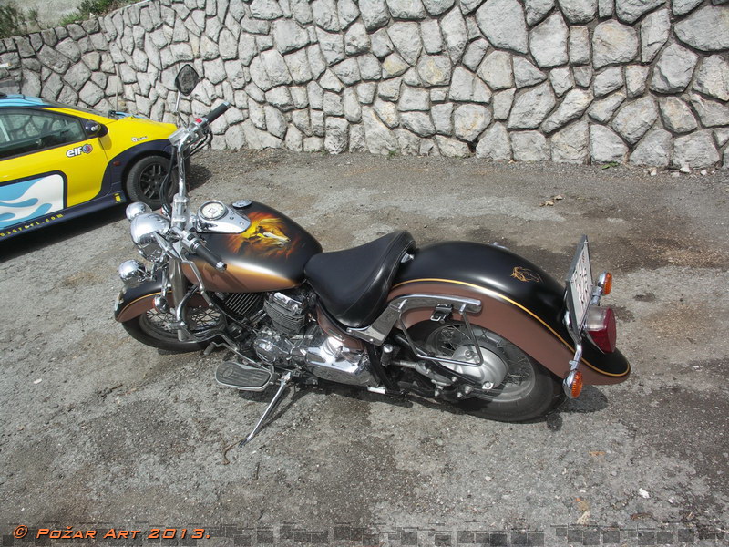 04.11.2013. Predstavljamo vam nekoliko motora koje smo imali prilike oslikat. Metalik siva kombinacija i mat smeđe crna kombinacija Yamahe Dragstar uz par slika na temu konja. Replika Tamburini Corse na motoru Agusta Brutale, male dorade i dodaci na već prije oslikanoj austrijskoj Yamahi, dio Harleya u kompletu s kacigama, nova Yamaha Midnight star na temu indijanaca te za kraj sladak "Old style" uradak bobera od motora Jawa! Ostale fotke u galeriji motori. |