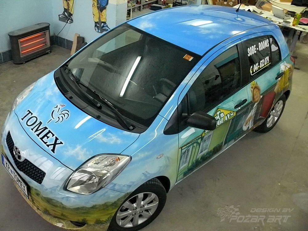 13.04.2009. Totalno oslikana nova Toyota Yaris u promotivne svrhe tvrtke Tomex iz Il.Bistrice. Bilo je bitno da se prikaže, tj. da asocira na ludi provod u Triglav Pub-u i da se tvrtka također bavi i uzgojem peradi. Ostalo je nadopisano sa naljepnicama po staklu. To i dva poklopca kotača nove su stvari u galeriji automobili. |